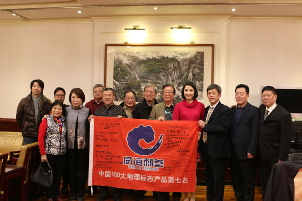 台湾文化艺术等各界人士在威海刺参旗帜上签名后合影,为威海刺参声援助推。